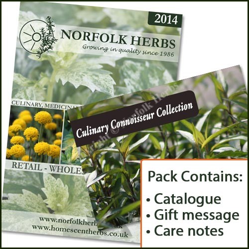 Each pack will contain fully established plants in 10cm (4 inch) pots each with their own descriptive and instruction label. Your collection will also include a care leaflet, a gift card and a Norfolk Herbs catalogue.